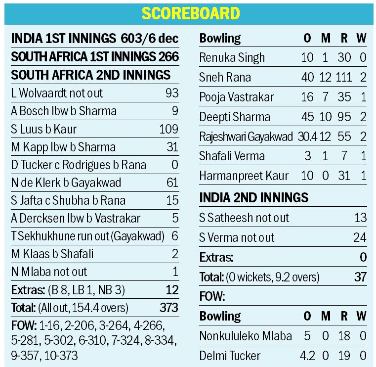 India were made to wait a tad longer for the winning moment by centurion Laura Wolvaardt but crossed the finish line in style as they won by 10 wickets on the fourth and final day of the one-off women’s Test against South Africa here today.