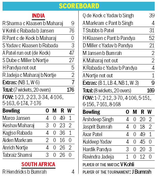 In complete contrast, Miller hung his head while resting his arms on the billboards on the fence. He could have steered his side to the greatest victory in South Africa’s cricket history but his shot off Pandya off the first ball of the last over, soaring high, was halted by a SKY (Suryakumar Yadav) special on the boundary ropes.